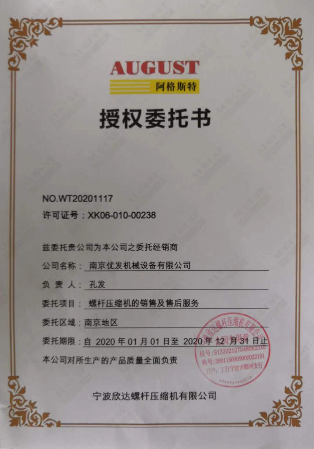 阿格斯特空壓機(jī)代理商證書(shū)-南京優(yōu)發(fā)機(jī)械江蘇總代理